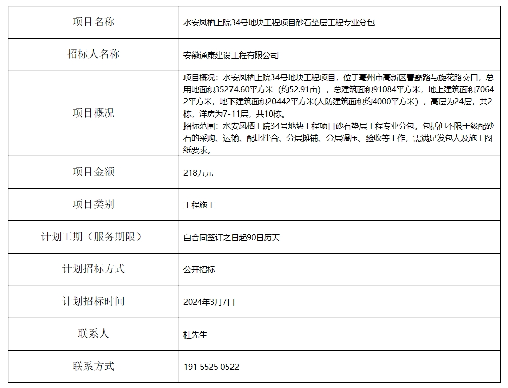 水安鳳棲上院34號(hào)地塊工程項(xiàng)目砂石墊層工程專業(yè)分包招標(biāo)計(jì)劃