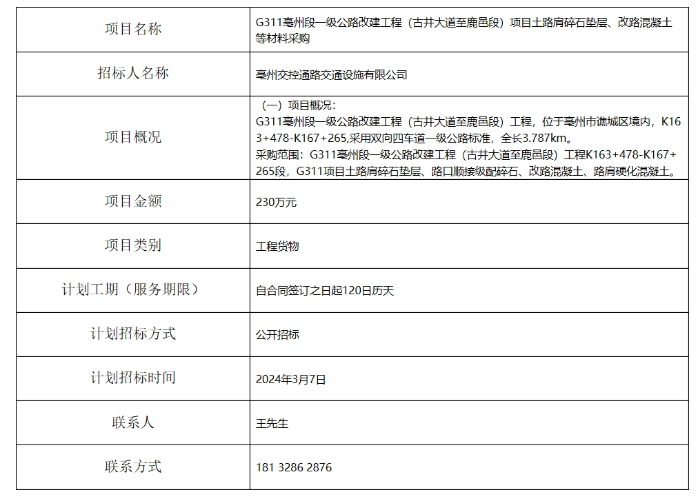 G311亳州段一級公路改建工程(古井大道至鹿邑段)項目土路肩碎石墊層、改路混凝土等材料采購招標(biāo)計劃
