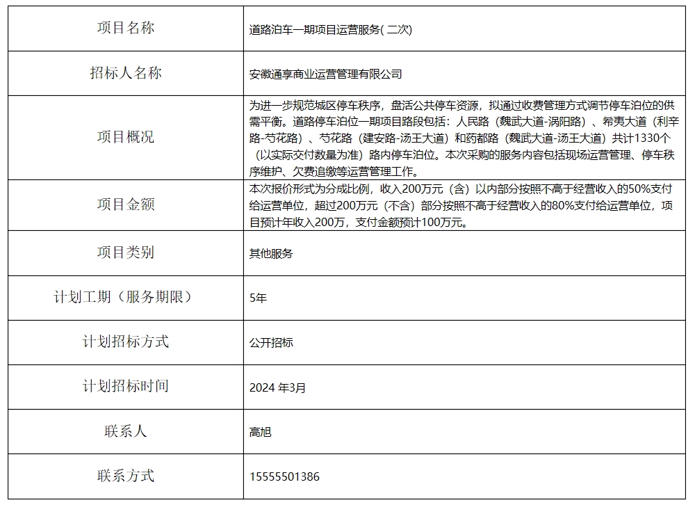 道路泊車一期項目運營服務( 二次)招標計劃