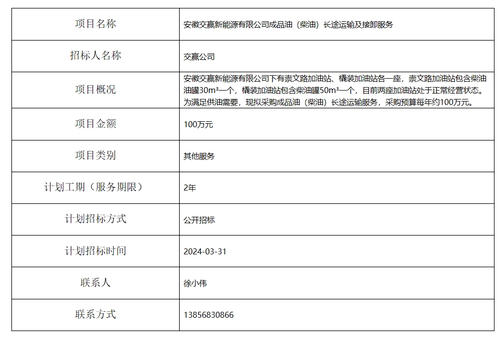 安徽交贏新能源有限公司成品油(柴油)長途運(yùn)輸及接卸服務(wù)招標(biāo)計(jì)劃