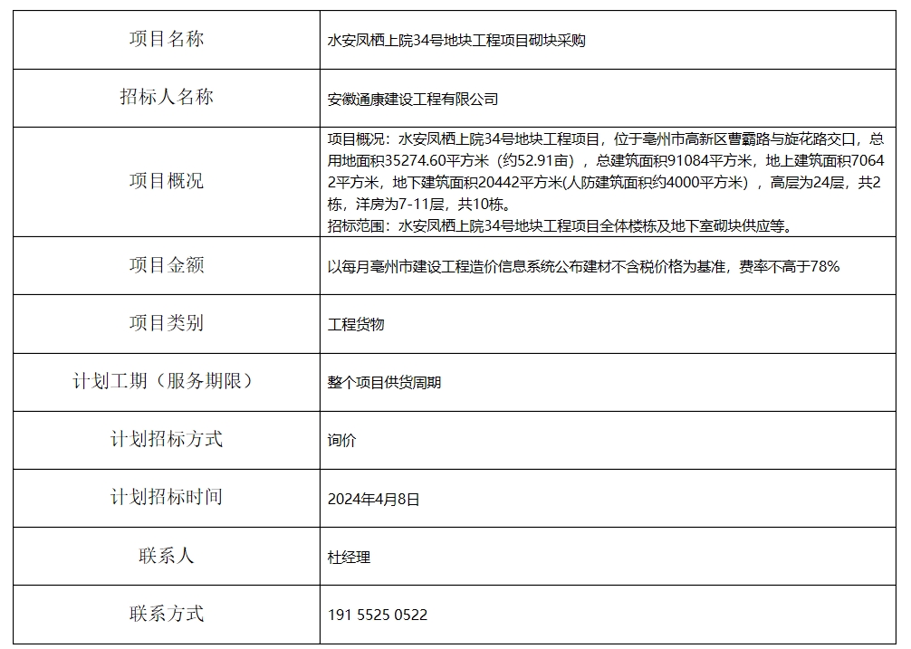 水安鳳棲上院34號地塊工程項目砌塊采購招標(biāo)計劃