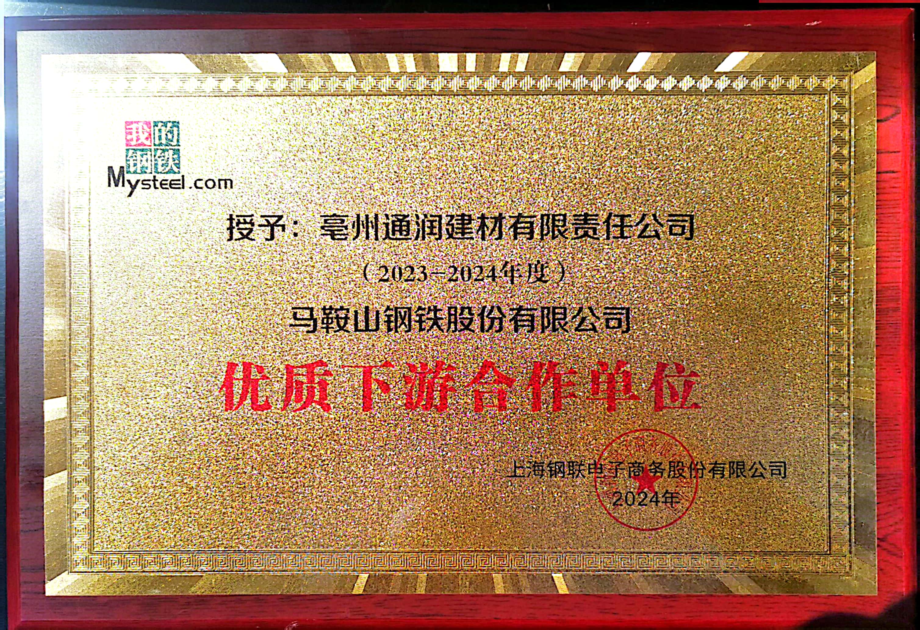 3月28日,在2024鋼鐵中國·第四屆安徽黑色金屬產(chǎn)業(yè)鏈供需交流研討大會上,亳州通潤建材有限責(zé)任公司獲得“2023-2024年度馬鞍山鋼鐵股份有限公司優(yōu)質(zhì)下游合作單位”,公司連續(xù)2年獲得此項榮譽(yù)。