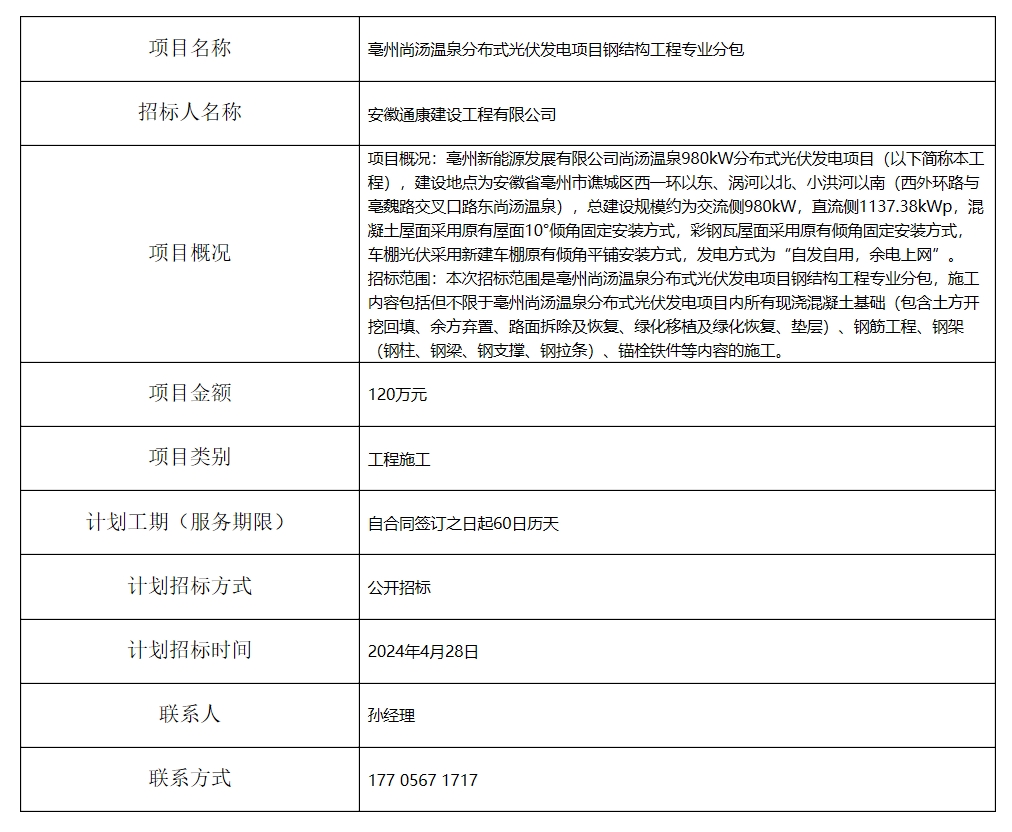 亳州尚湯溫泉分布式光伏發(fā)電項(xiàng)目鋼結(jié)構(gòu)工程專(zhuān)業(yè)分包招標(biāo)計(jì)劃