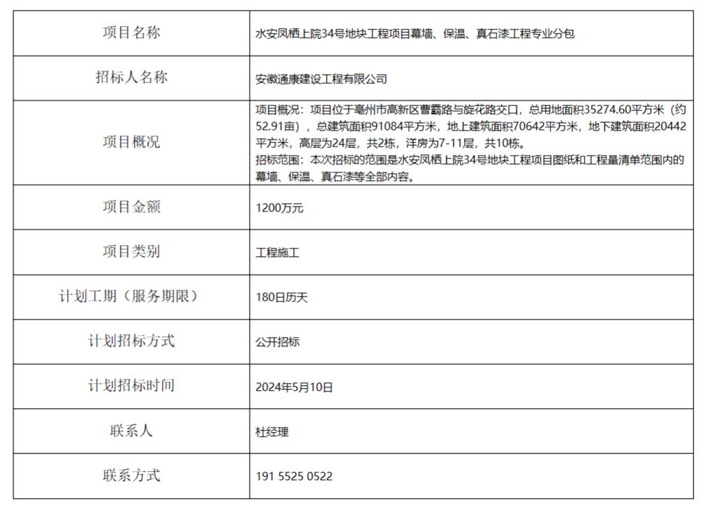 水安鳳棲上院34號地塊工程項目幕墻、保溫、真石漆工程專業(yè)分包招標計劃