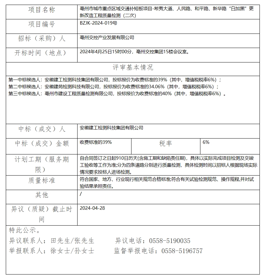亳州市城市重點區(qū)域交通補短板項目-希夷大道、人民路、和平路、新華路“白加黑”更新改造工程質(zhì)量檢測(二次)中標(biāo)(成交)結(jié)果公示
