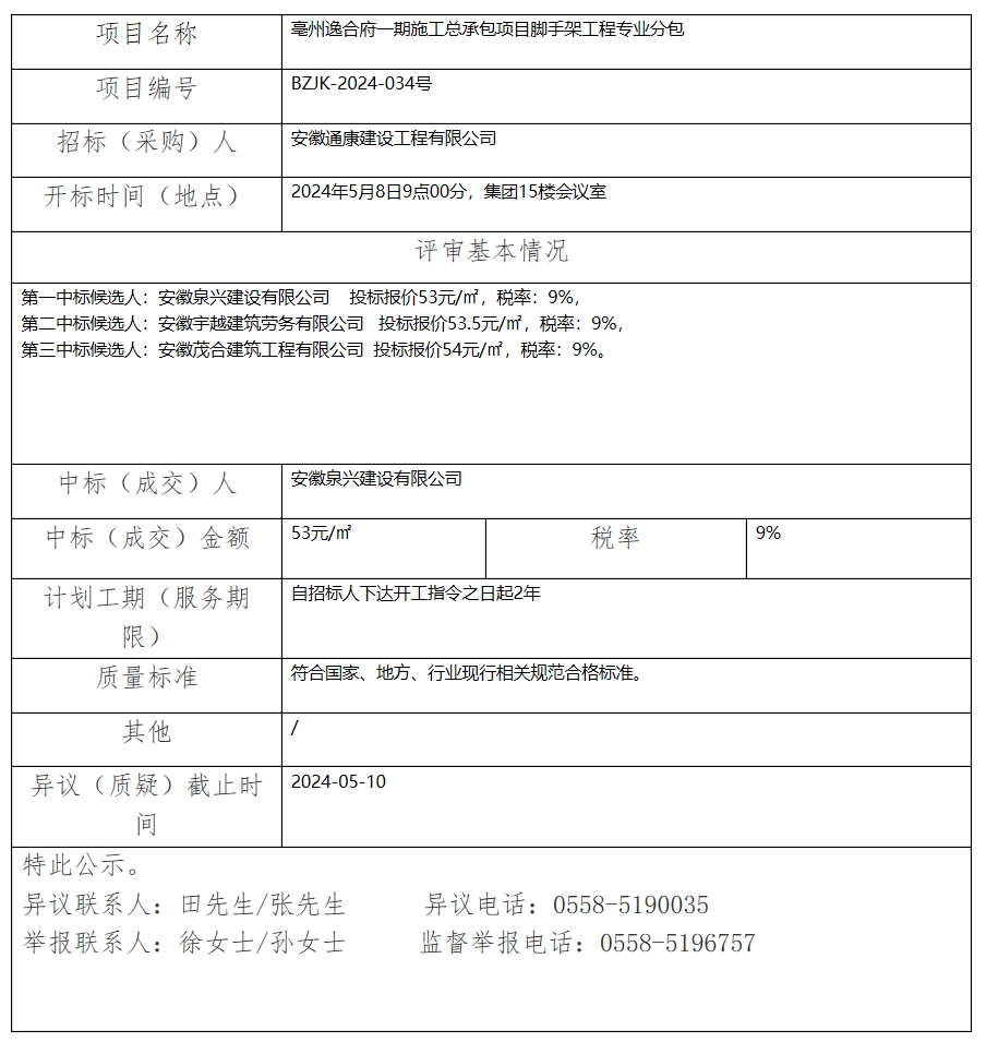 亳州逸合府一期施工總承包項(xiàng)目腳手架工程專(zhuān)業(yè)分包中標(biāo)(成交)結(jié)果公示