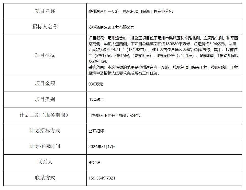 亳州逸合府一期施工總承包項目保溫工程專業(yè)分包招標計劃
