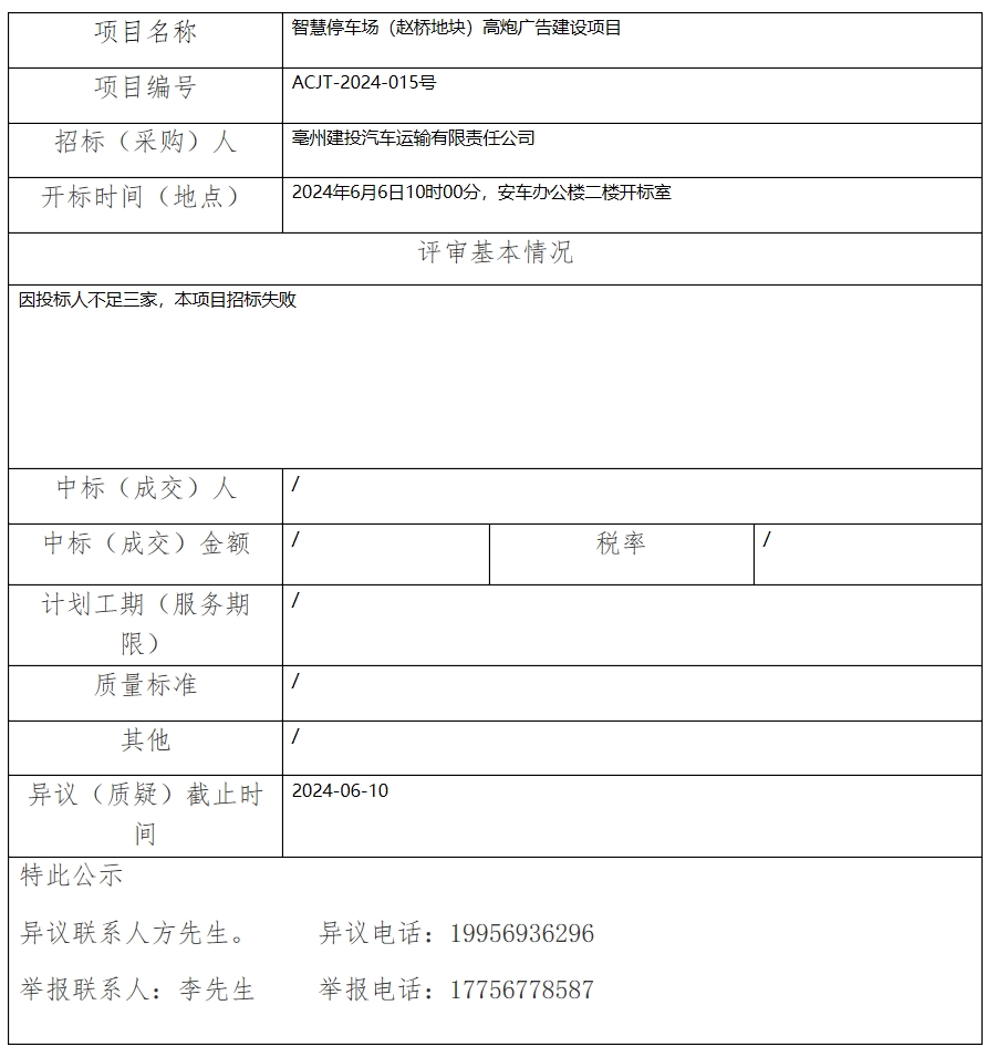 智慧停車場(趙橋地塊)高炮廣告建設(shè)項(xiàng)目中標(biāo)(成交)結(jié)果公示