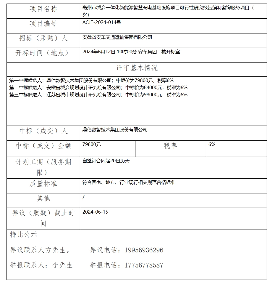 亳州市城鄉(xiāng)一體化新能源智慧充電基礎(chǔ)設(shè)施項目可行性研究報告編制咨詢服務(wù)項目(二次)中標(成交)結(jié)果公示