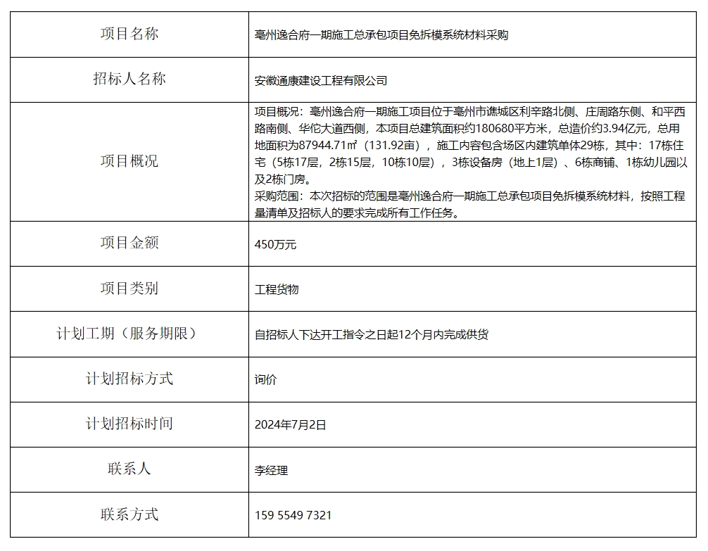 亳州逸合府一期施工總承包項目免拆模系統(tǒng)材料采購招標計劃