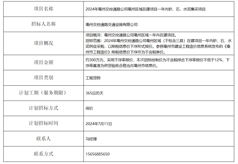 2024年亳州交控通路公司亳州區(qū)域在建項(xiàng)目一年內(nèi)砂、石、水泥集采項(xiàng)目招標(biāo)計(jì)劃
