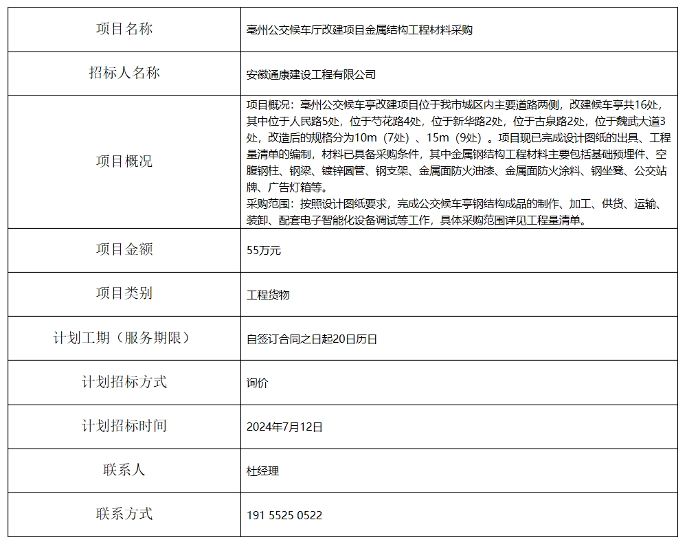 亳州公交候車廳改建項(xiàng)目金屬結(jié)構(gòu)工程材料采購招標(biāo)計(jì)劃