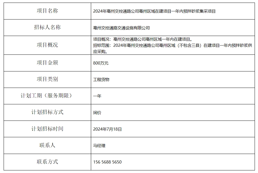 2024年亳州交控通路公司亳州區(qū)域在建項(xiàng)目一年內(nèi)預(yù)拌砂漿集采項(xiàng)目招標(biāo)計(jì)劃