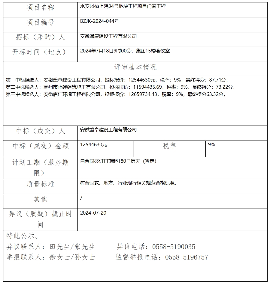 水安鳳棲上院34號地塊工程項(xiàng)目門窗工程中標(biāo)(成交)結(jié)果公示