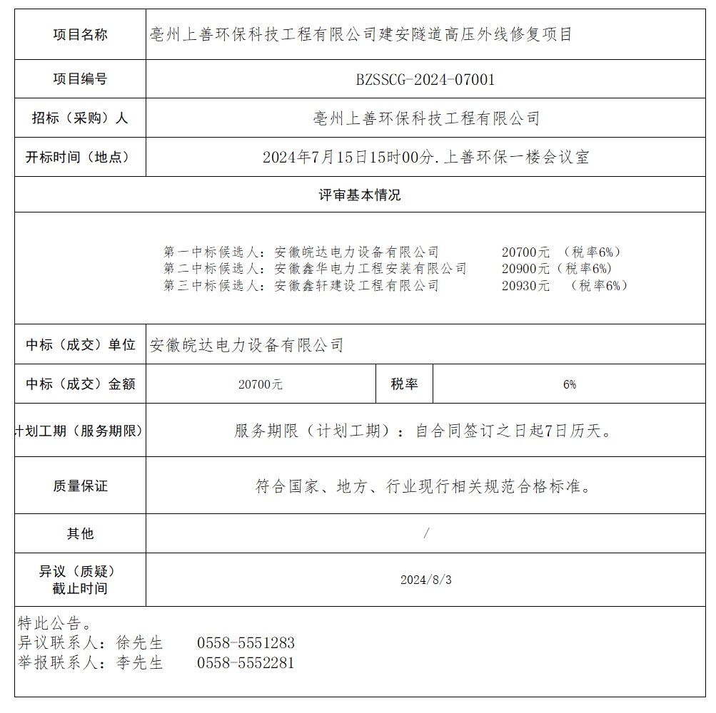 亳州上善環(huán)??萍脊こ逃邢薰窘ò菜淼栏邏和饩€修復(fù)項目中標(biāo)結(jié)果公示