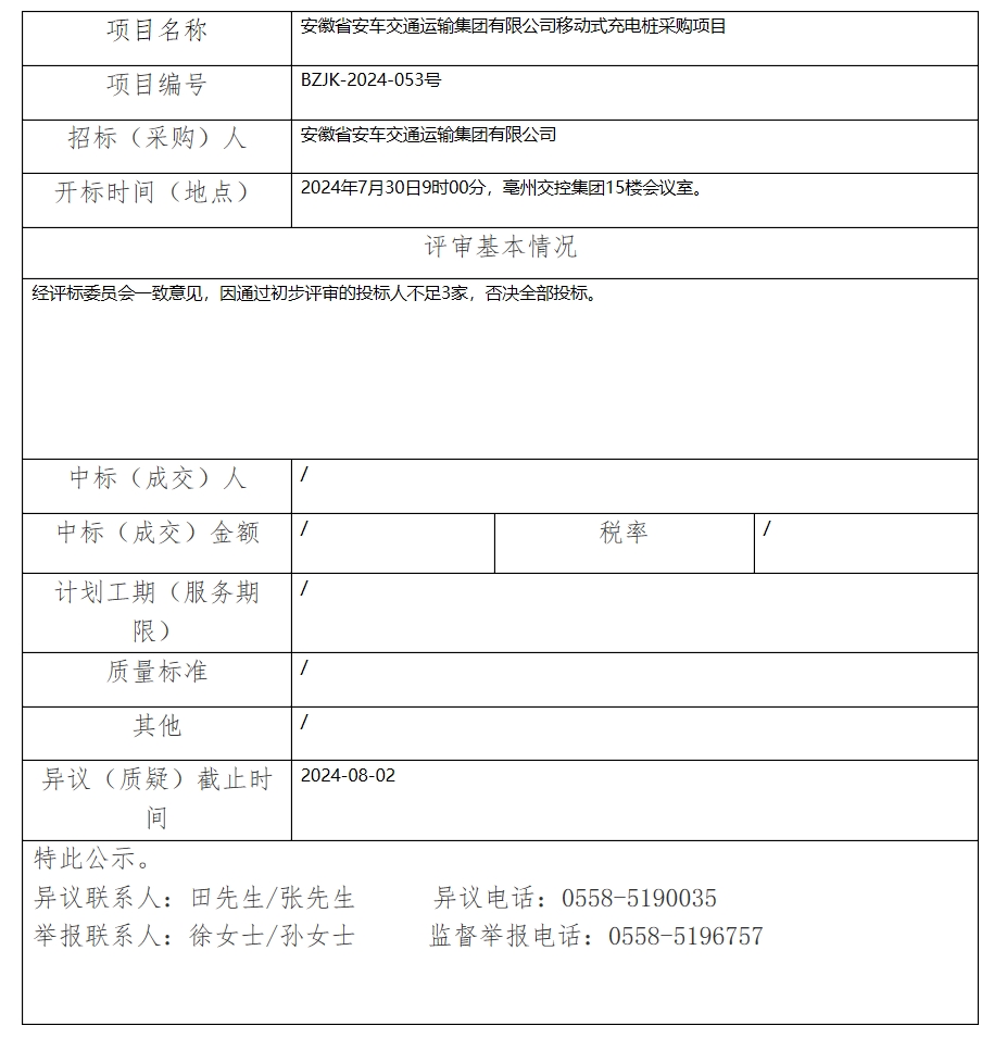 安徽省安車交通運(yùn)輸集團(tuán)有限公司移動式充電樁采購項目中標(biāo)(成交)結(jié)果公示