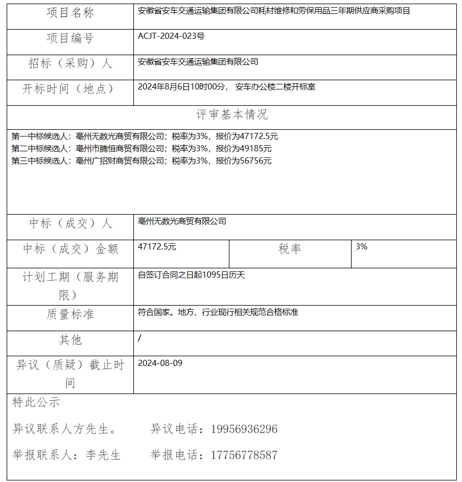 安徽省安車交通運輸集團有限公司耗材維修和勞保用品三年期供應商采購項目中標(成交)結果公示
