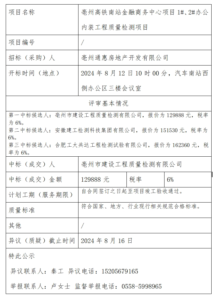 亳州高鐵南站金融商務(wù)中心項(xiàng)目1#、2#辦公內(nèi)裝工程質(zhì)量檢測項(xiàng)目中標(biāo)結(jié)果公示