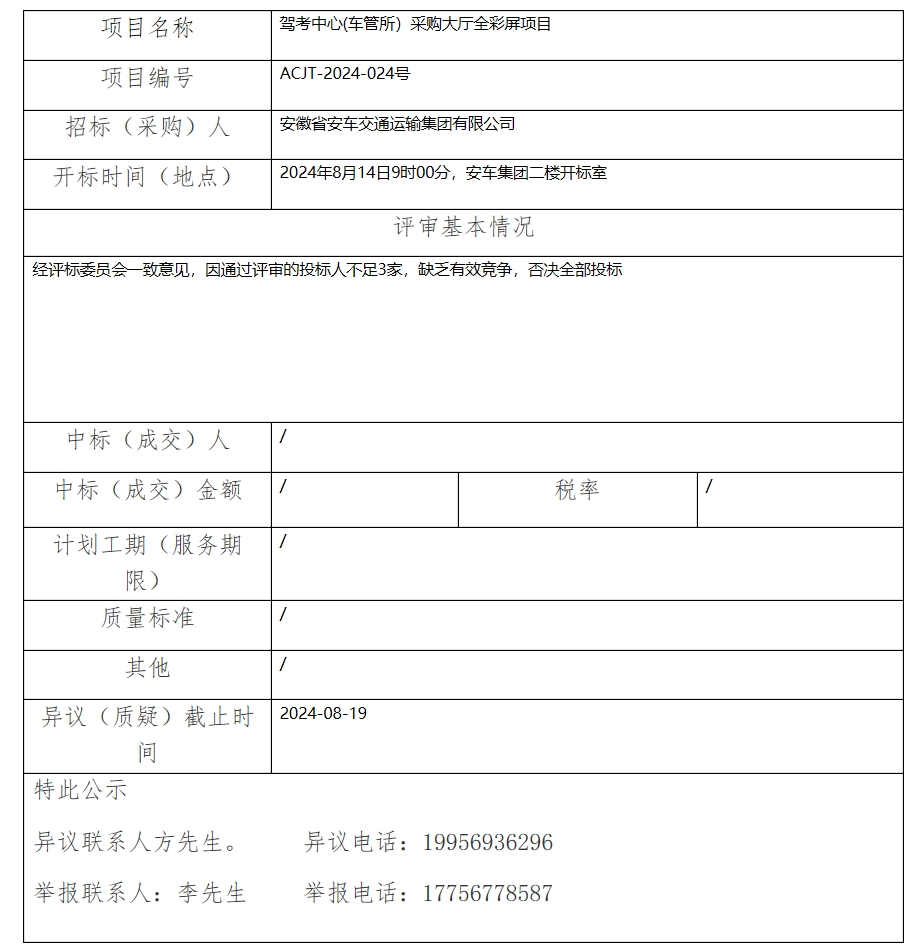 駕考中心(車管所)采購大廳全彩屏項目中標(biāo)(成交)結(jié)果公示