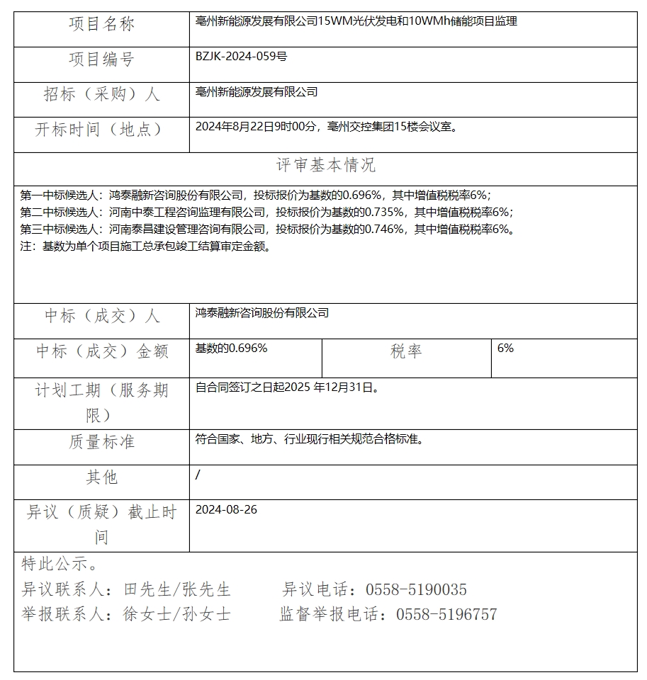 亳州新能源發(fā)展有限公司15MW光伏發(fā)電和10MWh儲能項目監(jiān)理中標(成交)結果公示
