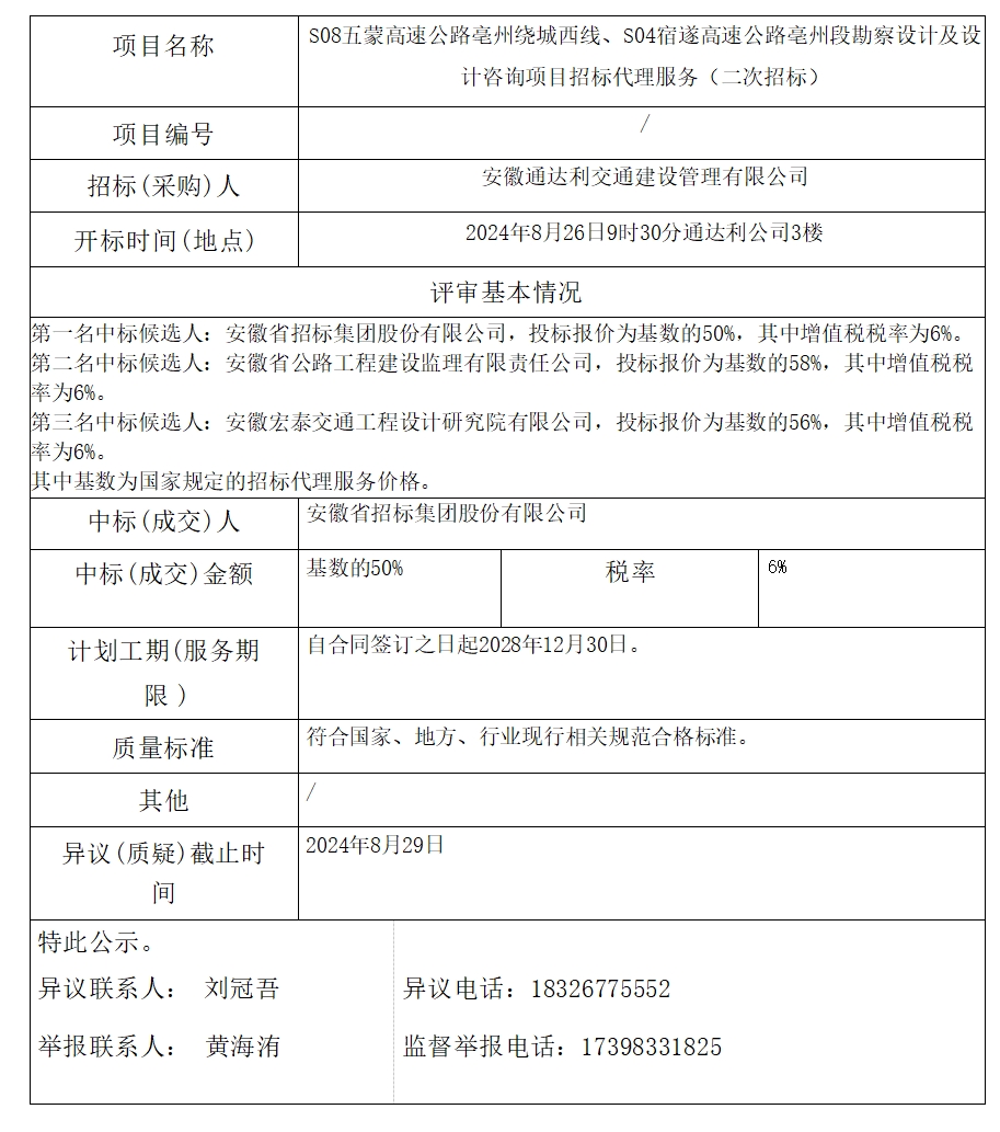 S08五蒙高速公路亳州繞城西線、S04宿遂高速公路亳州段勘察設(shè)計及設(shè)計咨詢項目招標(biāo)代理服務(wù)(二次招標(biāo))中標(biāo)(成交)結(jié)果公示
