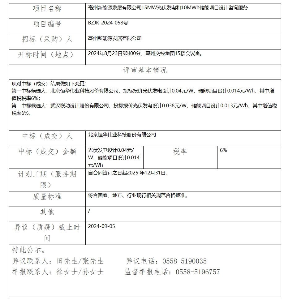 亳州新能源發(fā)展有限公司15MW光伏發(fā)電和10MWh儲(chǔ)能項(xiàng)目設(shè)計(jì)咨詢(xún)服務(wù)中標(biāo)結(jié)果變更公示
