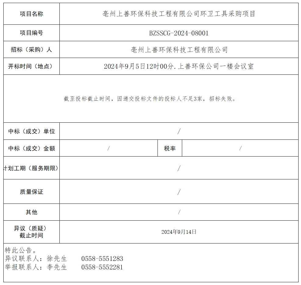 亳州上善環(huán)保科技工程有限公司環(huán)衛(wèi)工具采購項目中標結果公示