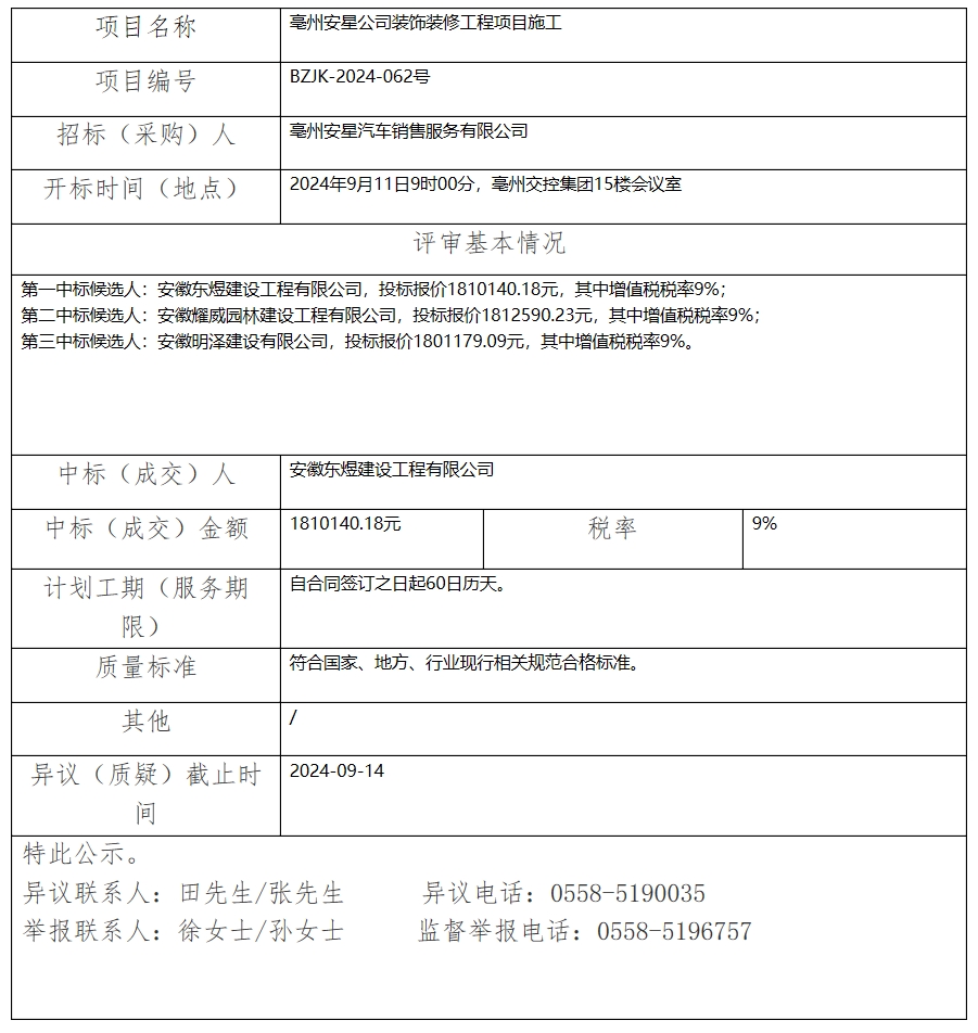 亳州安星公司裝飾裝修工程項目施工中標(成交)結(jié)果公示