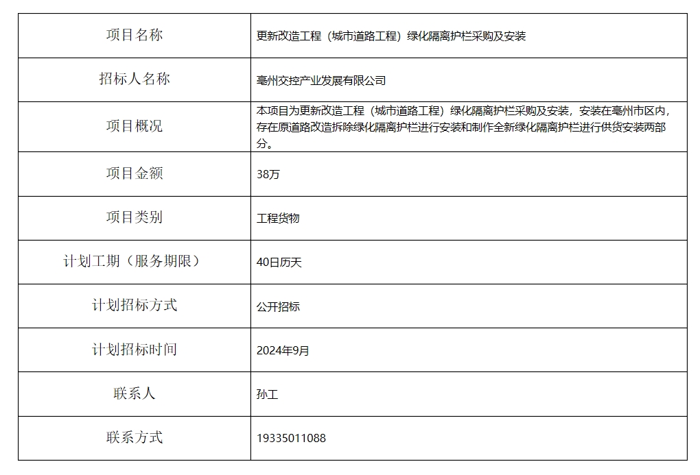 更新改造工程(城市道路工程)綠化隔離護(hù)欄采購(gòu)及安裝招標(biāo)計(jì)劃