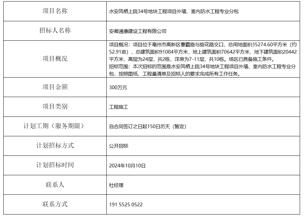 水安鳳棲上院34號(hào)地塊工程項(xiàng)目外墻、室內(nèi)防水工程專業(yè)分包招標(biāo)計(jì)劃