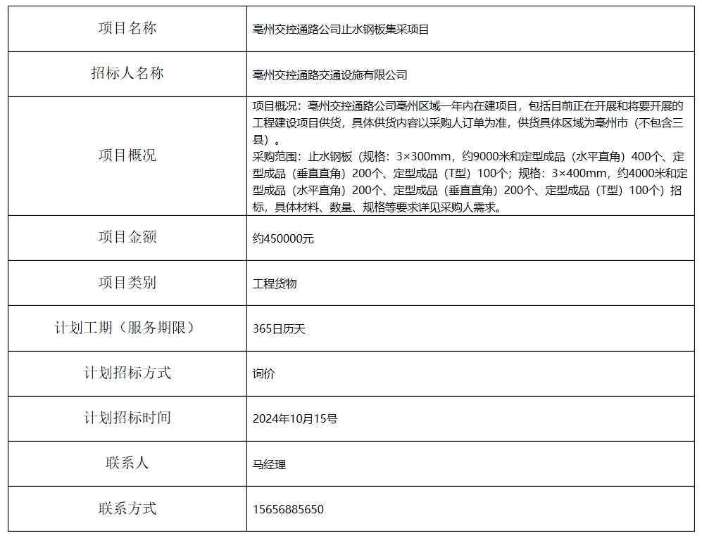 亳州交控通路公司止水鋼板集采項(xiàng)目招標(biāo)計(jì)劃