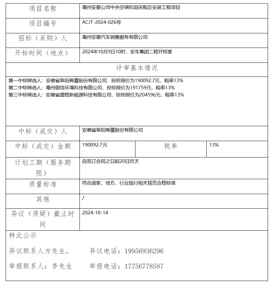 亳州安星公司中央空調(diào)機(jī)組采購(gòu)及安裝工程項(xiàng)目中標(biāo)(成交)結(jié)果公示