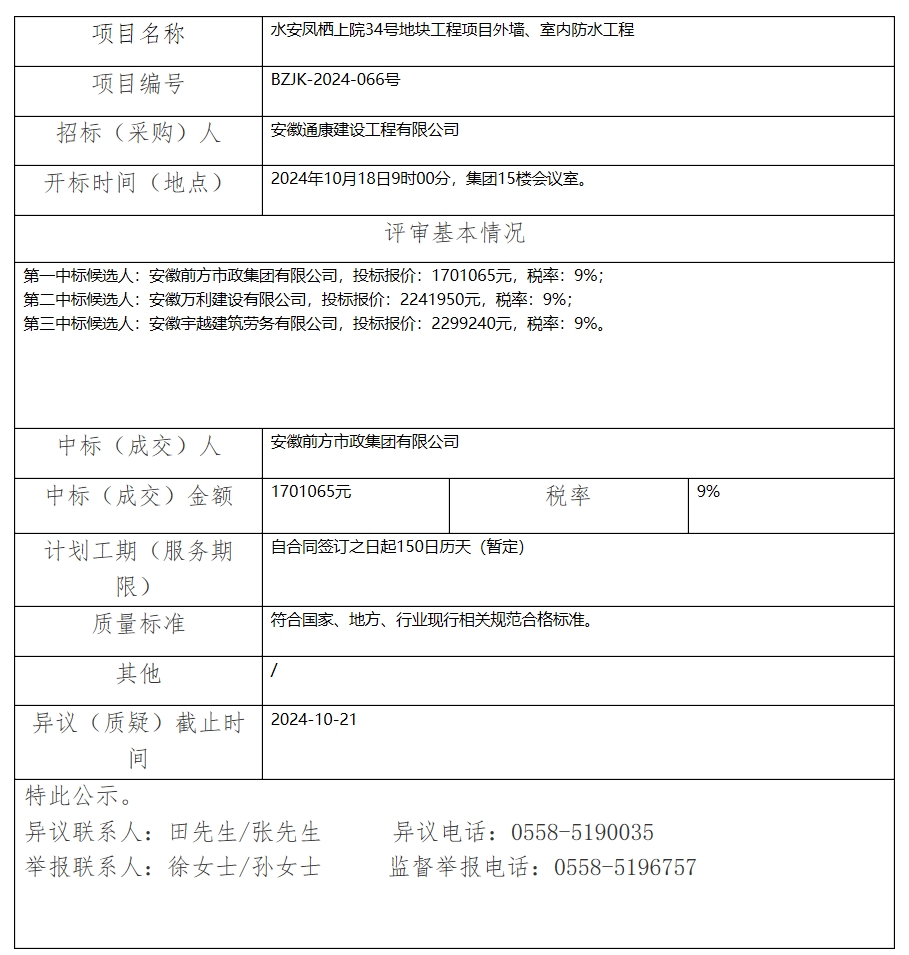 水安鳳棲上院34號地塊工程項目外墻、室內(nèi)防水工程中標(成交)結(jié)果公示