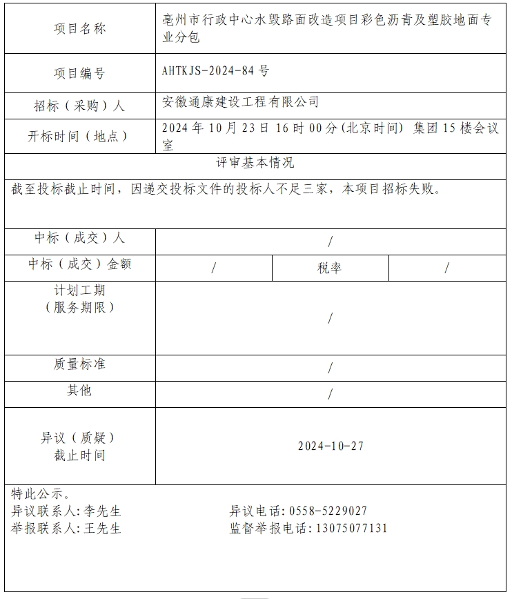 亳州市行政中心水毀路面改造項(xiàng)目彩色瀝青及塑膠地面專業(yè)分包中標(biāo)(成交)結(jié)果公示