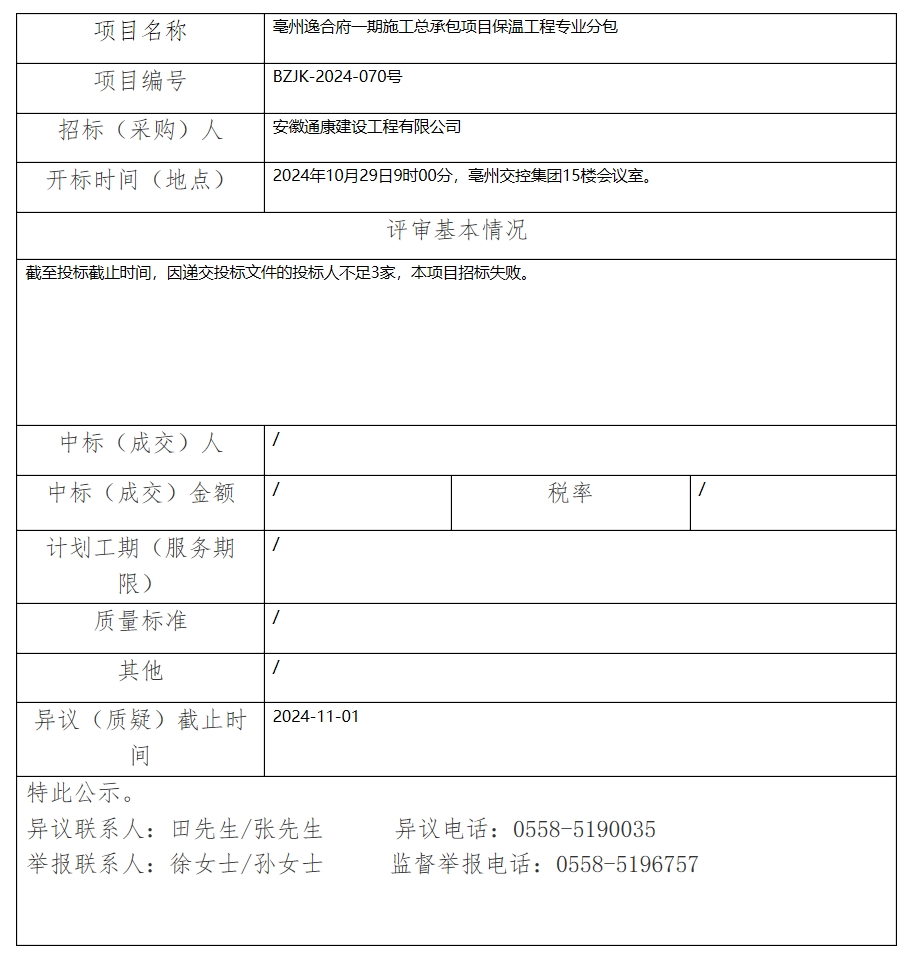 亳州逸合府一期施工總承包項(xiàng)目保溫工程專業(yè)分包中標(biāo)(成交)結(jié)果公示