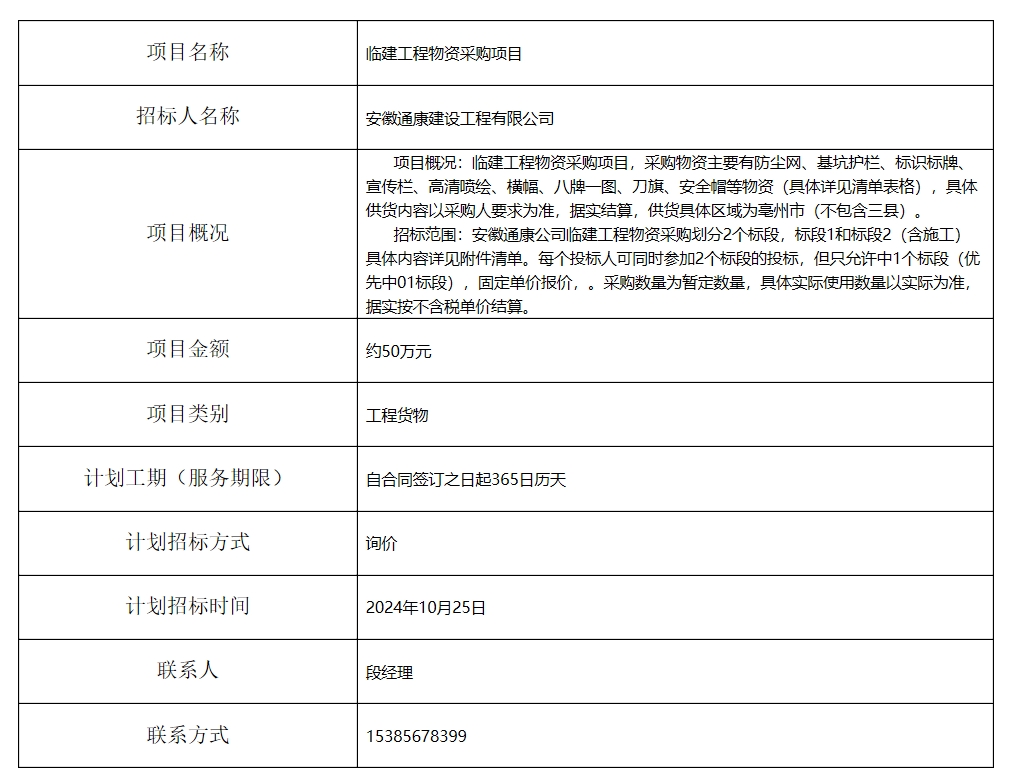 臨建工程物資采購(gòu)項(xiàng)目招標(biāo)計(jì)劃