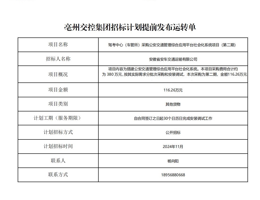 駕考中心(車管所)采購公安交通管理綜合應(yīng)用平臺社會化系統(tǒng)項(xiàng)目(第二期) 招標(biāo)計(jì)劃