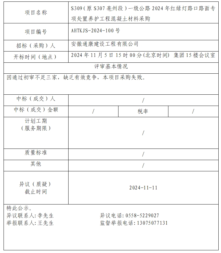 S309(原S307亳州段)一級公路2024年紅綠燈路口路面專項(xiàng)處置養(yǎng)護(hù)工程混凝土材料采購中標(biāo)(成交)結(jié)果公示