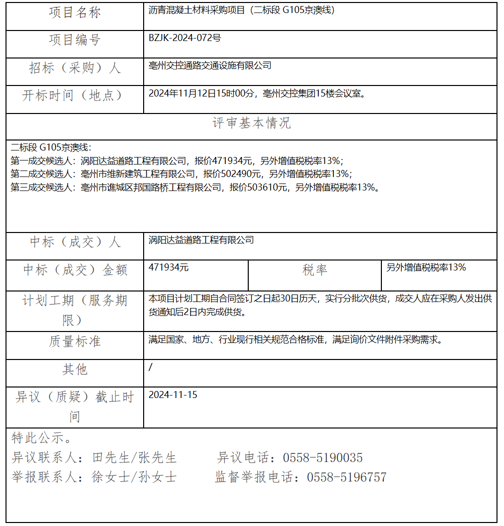 瀝青混凝土材料采購項目(二標(biāo)段 G105京澳線)中標(biāo)(成交)結(jié)果公示