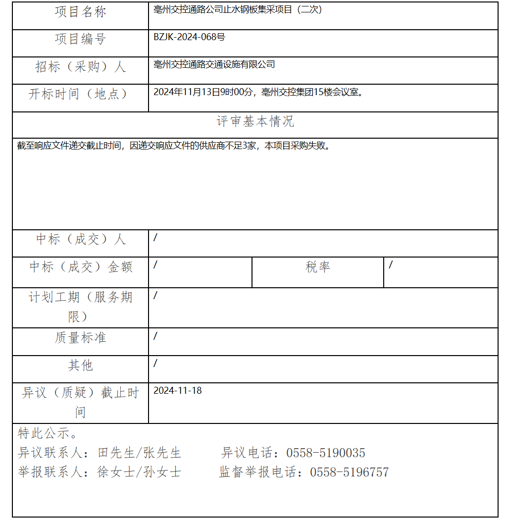 亳州交控通路公司止水鋼板集采項(xiàng)目(二次) 中標(biāo)(成交)結(jié)果公示
