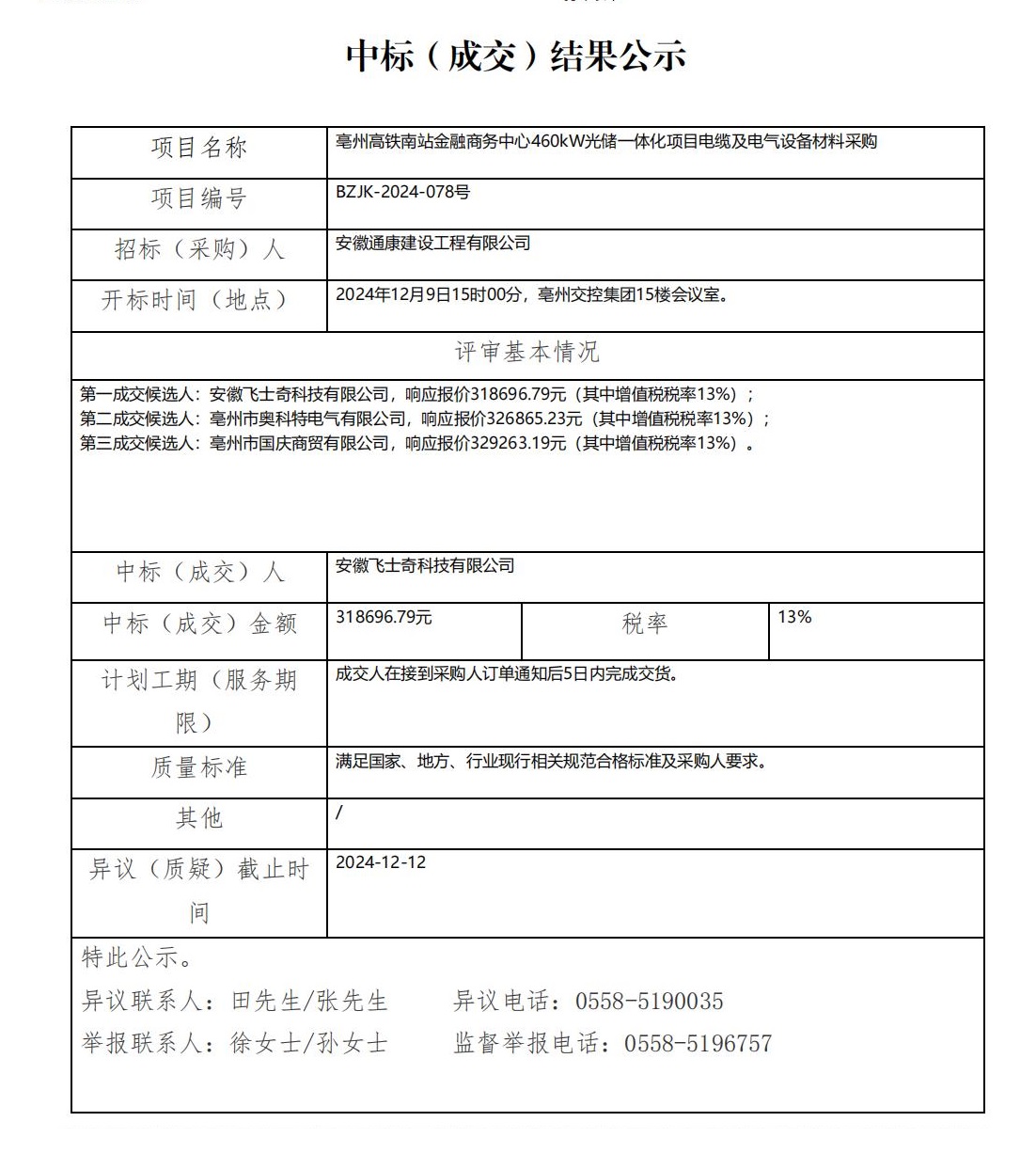 亳州高鐵南站金融商務(wù)中心460kW光儲(chǔ)一體化項(xiàng)目電纜及電氣設(shè)備材料采購中標(biāo)(成交)結(jié)果公示