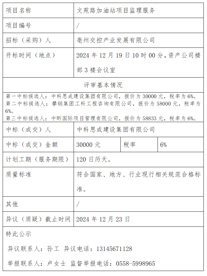 文苑路加油站項目監(jiān)理服務中標結(jié)果公示