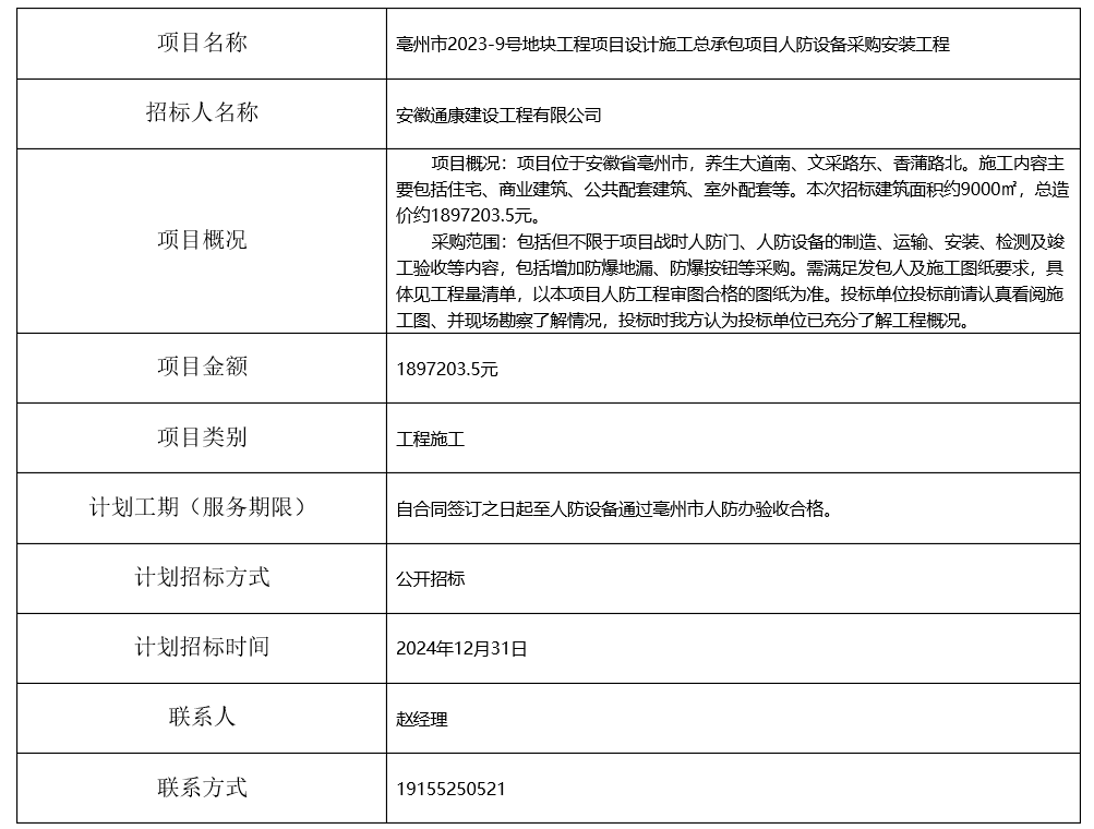 亳州市2023-9號(hào)地塊工程項(xiàng)目設(shè)計(jì)施工總承包項(xiàng)目人防設(shè)備采購安裝工程招標(biāo)計(jì)劃