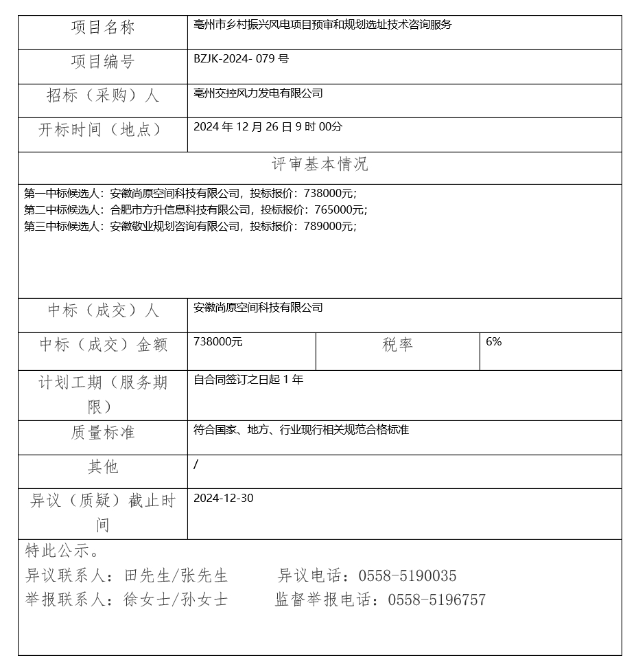 亳州市鄉(xiāng)村振興風(fēng)電項(xiàng)目預(yù)審和規(guī)劃選址技術(shù)咨詢(xún)服務(wù)中標(biāo)(成交)結(jié)果公示