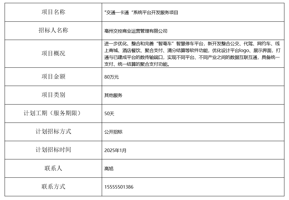 "交通一卡通“系統(tǒng)平臺(tái)開(kāi)發(fā)服務(wù)項(xiàng)目 招標(biāo)計(jì)劃