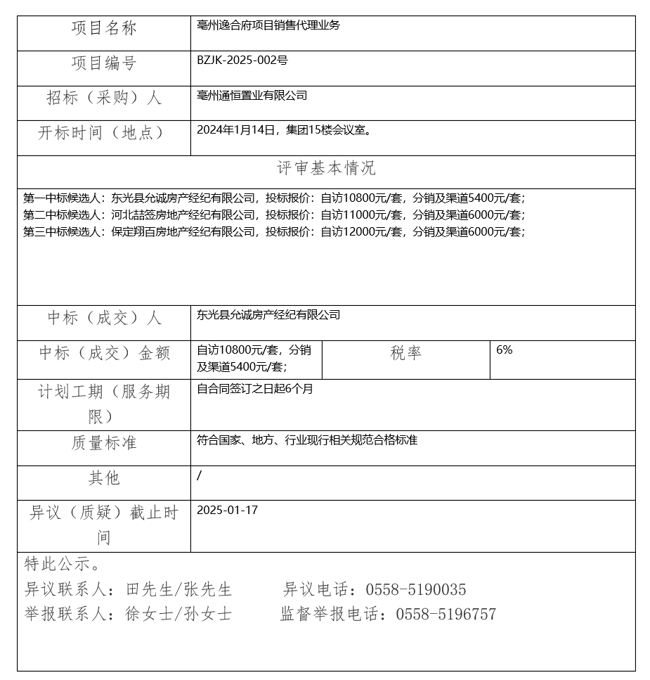 亳州逸合府項(xiàng)目銷售代理業(yè)務(wù)中標(biāo)(成交)結(jié)果公示