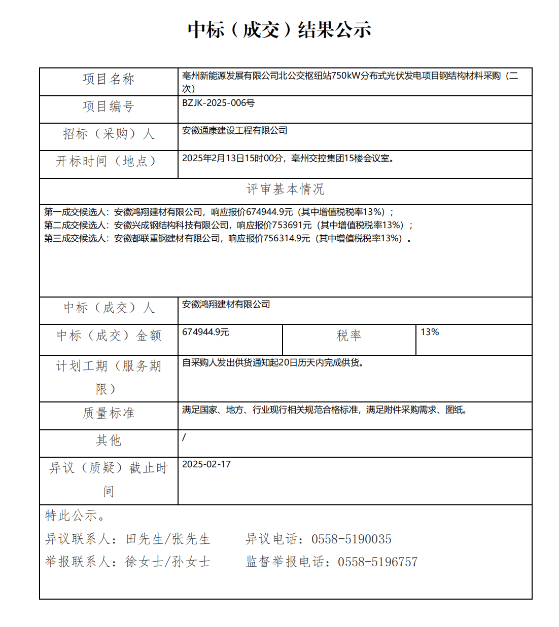 亳州新能源發(fā)展有限公司北公交樞紐站750kW分布式光伏發(fā)電項目鋼結構材料采購(二次)中標(成交)結果公示