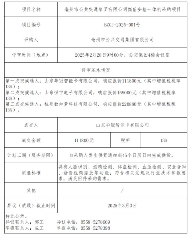 亳州市公共交通集團(tuán)有限公司崗前安檢一體機(jī)采購(gòu)項(xiàng)目成交結(jié)果公示
