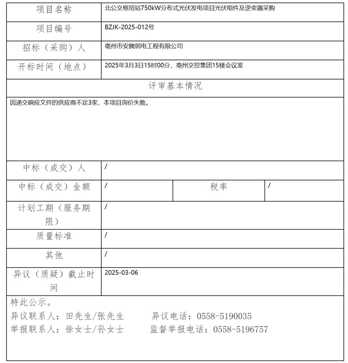 北公交樞紐站750kW分布式光伏發(fā)電項目光伏組件及逆變器采購中標(biāo)(成交)結(jié)果公示