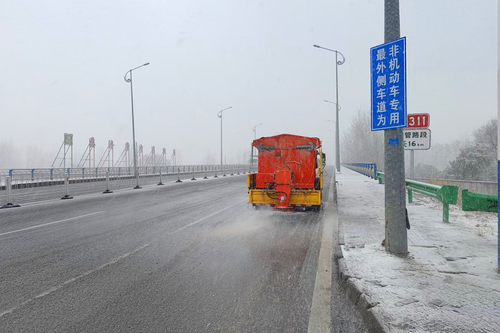 通達(dá)利公司、通康公司加大管養(yǎng)路段巡查力度,按照“機(jī)械為主、人工為輔”的原則,組織養(yǎng)護(hù)人員和機(jī)械在管養(yǎng)路段拋灑融雪劑,針對陡坡、彎道、橋梁等重點區(qū)域,加強(qiáng)動態(tài)監(jiān)測,實時掌握路況信息,通過“雪前預(yù)防性處置、雪中連續(xù)性作業(yè)、雪后精細(xì)化清理”三階段閉環(huán)管理,確保實現(xiàn)管養(yǎng)路段“零結(jié)冰、無阻斷”目標(biāo),保障行車安全。